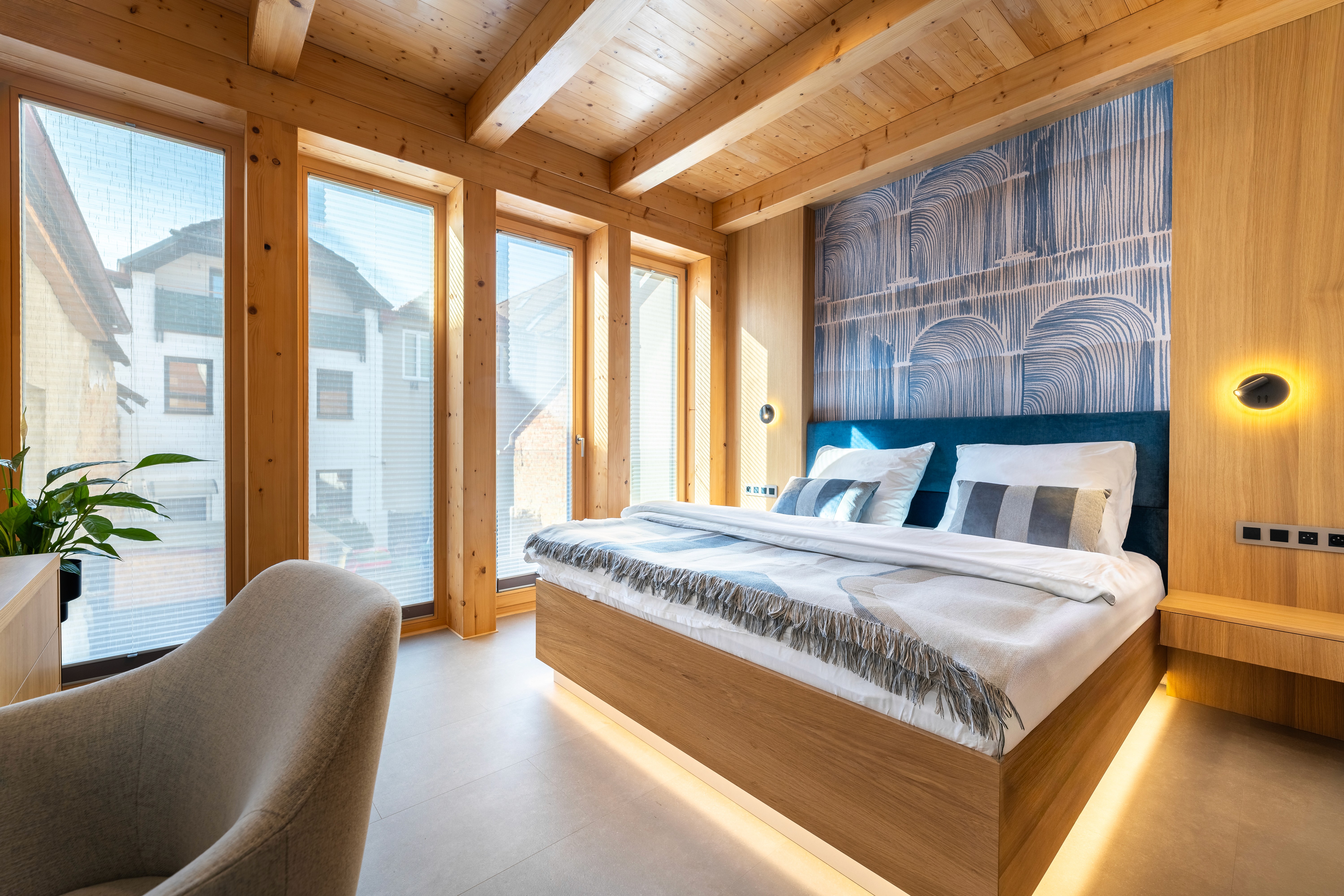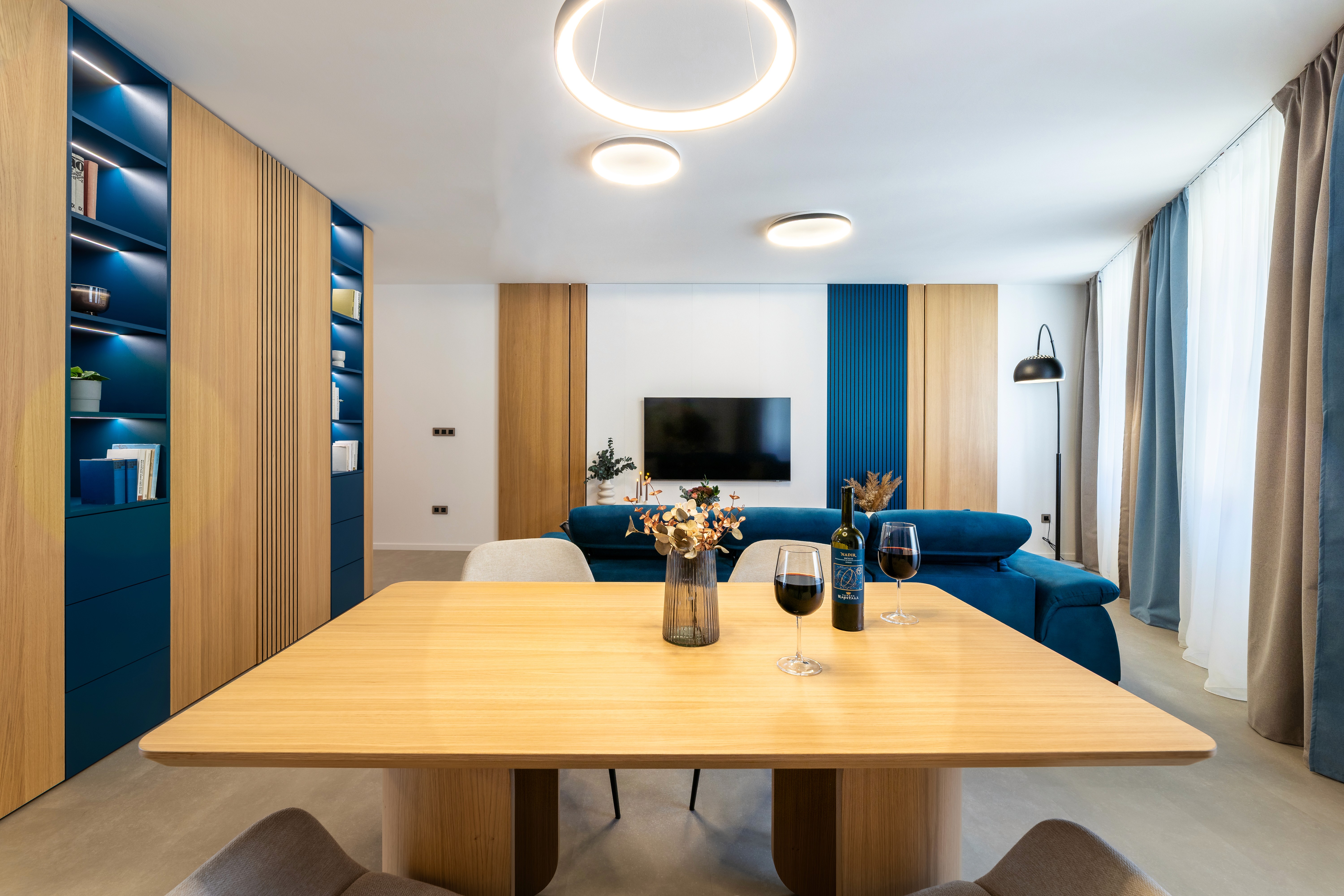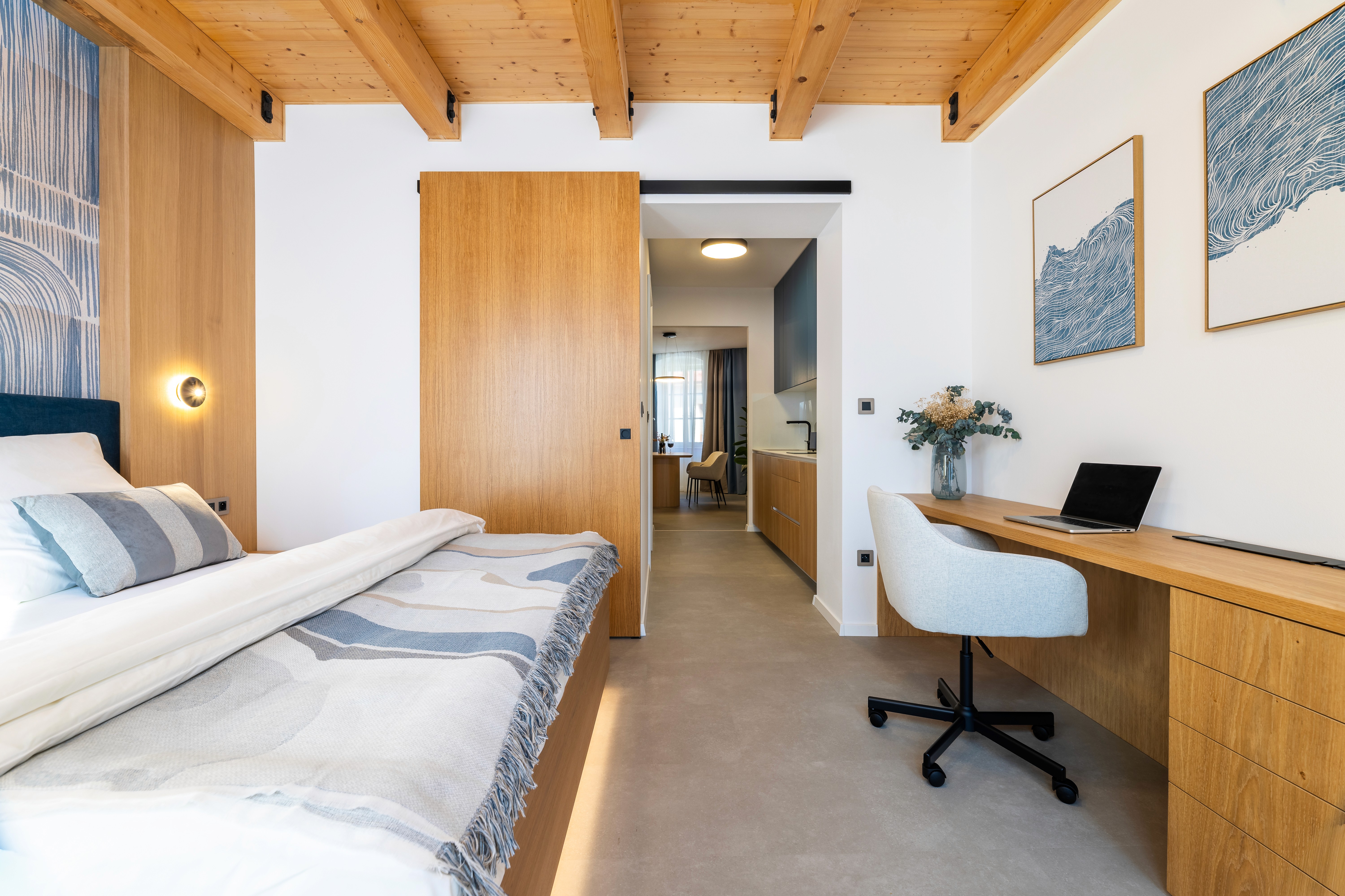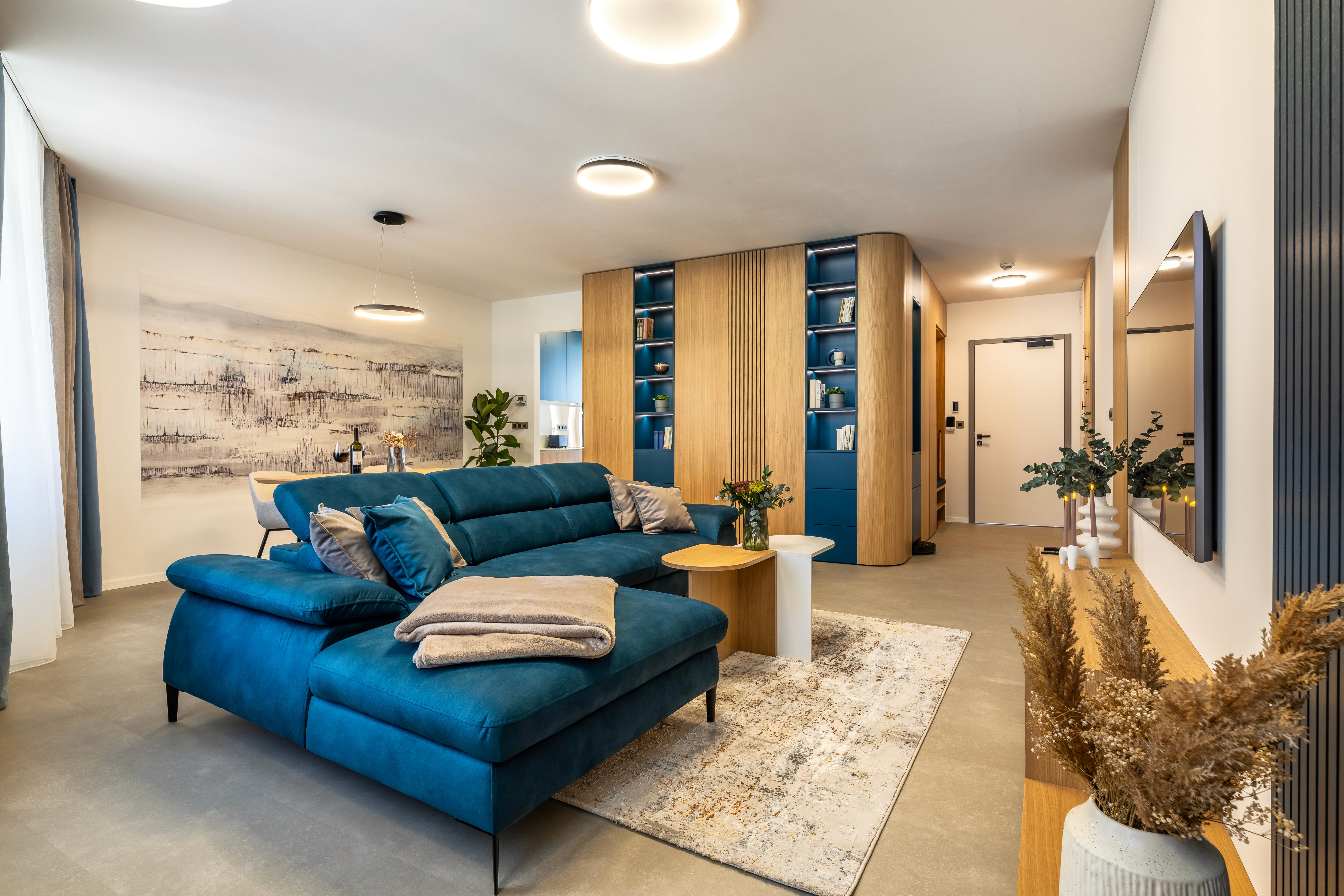 Velkorysý modrý apartmán podtrhující atmosféru domova s lehkou noblesou. Spojení funkčnosti, barev a světla vytváří klid pro práci, pohodlí pro odpočinek a pocit, že jste tu správně – i když jen na chvíli.