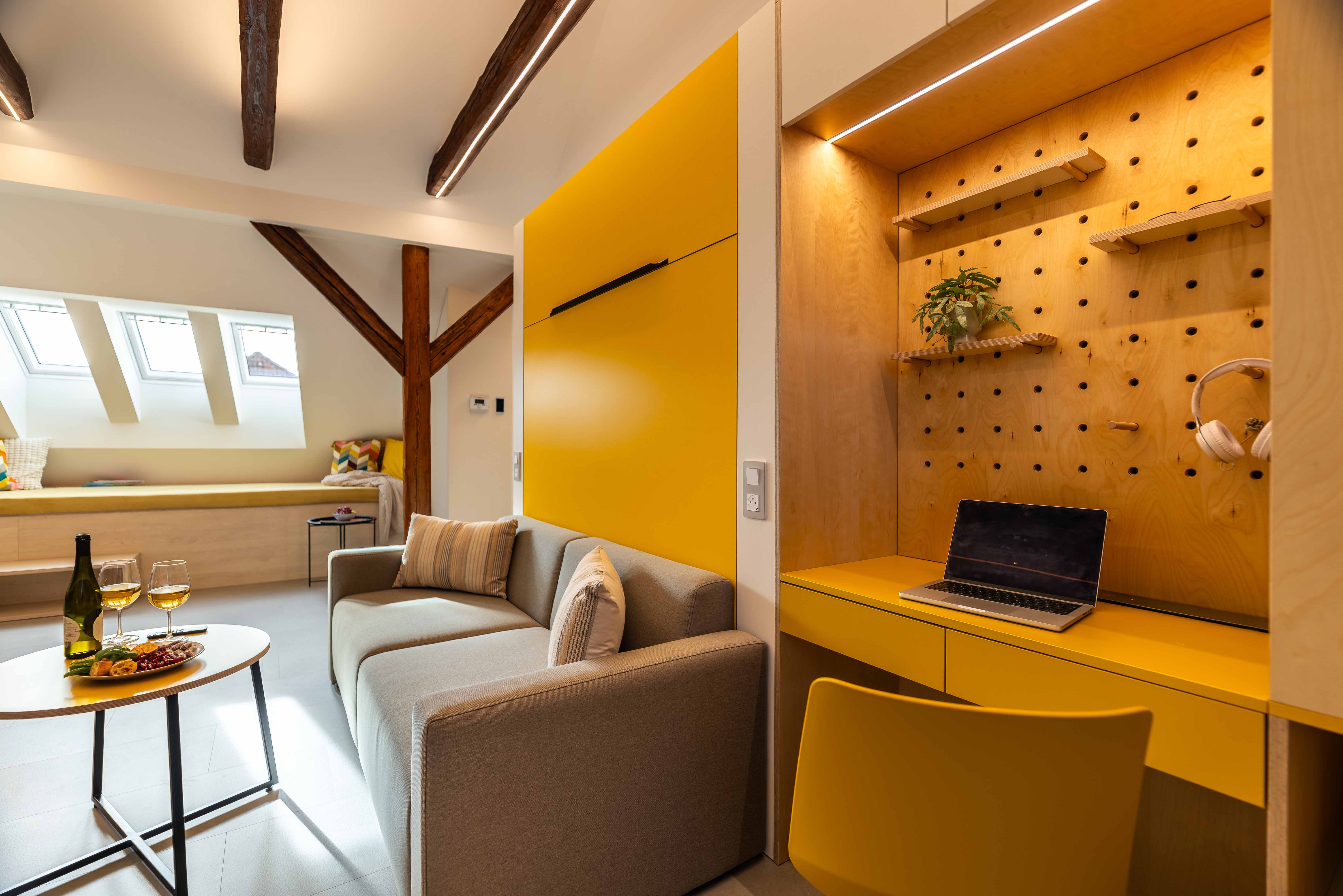Žlutý apartmán - jeden propojený celek, vytvářející příjemnou atmosféru, která je vzdušná, praktická i útulná. Je to místo, které snadno přijmete za své – na práci, odpočinek i jako druhý domov pro rychlé pracovní cesty.